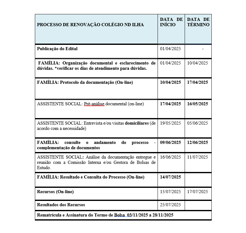 - Organização documental e esclarecimento de dúvidas: a família do educando já contemplado com a Bolsa de Estudo deverá reunir os documentos previstos no Edital 01/2025 que condizem com a sua realidade. Em caso de dúvidas, os responsáveis devem solicitar atendimento da assistente social do Colégio Notre Dame Ilha, no período compreendido entre 01 e 10 de abril de 2025.