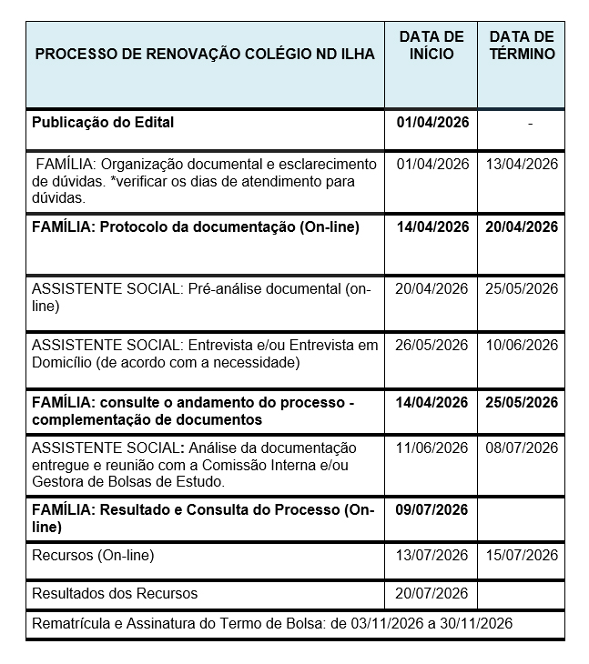 A renovação de bolsas de estudos filantrópicas ocorrerá conforme os prazos descritos abaixo: