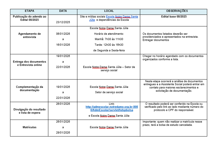 • Matrícula: caso o(a) estudante tenha sido contemplado(a) com a Bolsa de Estudo, seu responsável deve ir à Escola Notre Dame Santa Júlia, até 29 de janeiro de 2026, para efetuar a matrícula.